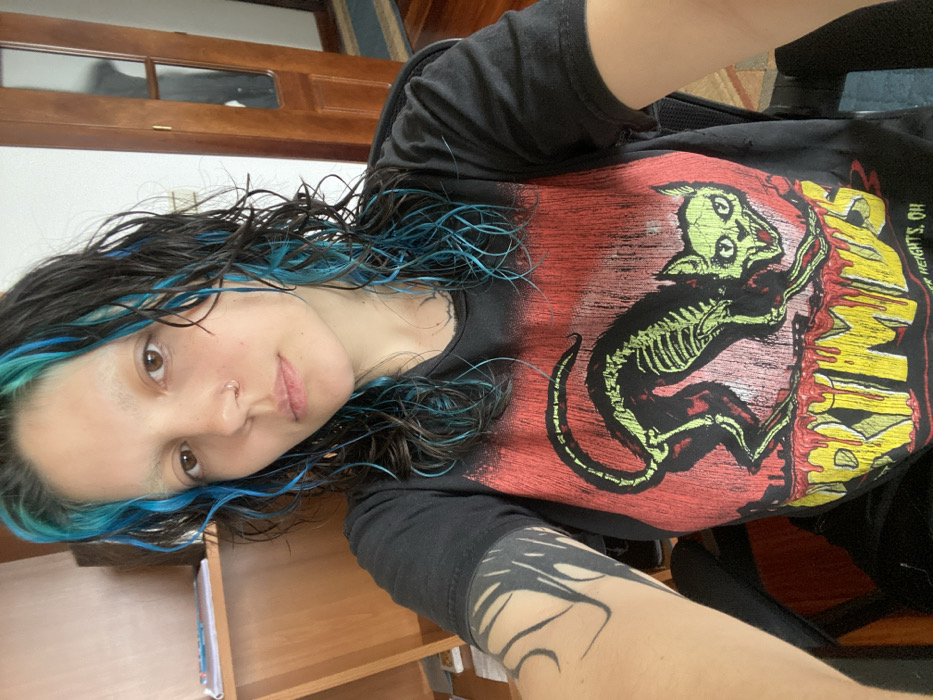 A female individual is depicted in a frontal selfie, seated indoors. She has light skin, brown eyes, and a neutral facial expression with lightly colored eyebrows. A small silver ring pierces her left nostril. Her dark hair features prominent bright teal and turquoise streaks, appearing wet and wavy. She wears a black short-sleeved t-shirt with a graphic design: a black skeletal cat with neon green bones and skull, positioned over a distressed red background. Below the cat, the word "PRIMUS" is visible in yellow, dripping text, with "COLUMBUS, OH" partially legible underneath. A large, abstract black tattoo covers the outer aspect of her left forearm and upper arm. She is seated in a black office-style chair, parts of which are visible. The background to her left includes a light-colored wooden bookshelf or storage unit with papers. To her right, a closed wooden interior door with a glass panel is visible, with a dark blue or gray rug on hardwood flooring in front of it. The lighting is bright and even. No specific visual elements within the image allow for the identification of a precise location within the city of Gijón, Spain.