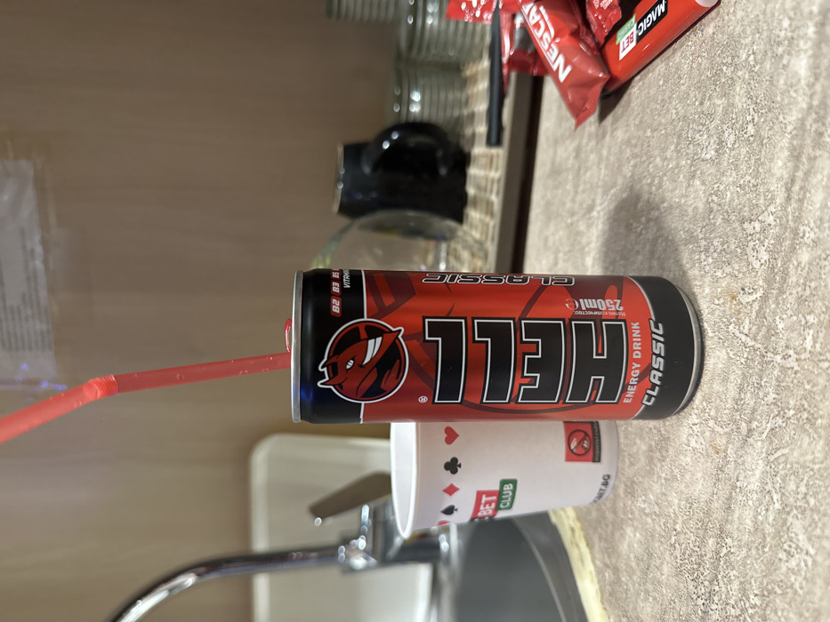 The scene is an indoor view of a countertop, likely in a break area or service counter, located in Plovdiv, Bulgaria. In the center, a red and black 250ml "HELL CLASSIC" energy drink can, bearing a red devil head logo, stands with a red plastic bendy straw inserted into its top opening, exhibiting minor liquid residue on the straw. To the left of the can is a white paper cup featuring black and red playing card suit symbols (spades, hearts, clubs, diamonds) along its rim, and branded with "WINBET CLUB" in green and red text, accompanied by a partial ".BG" web address and a "no smoking" symbol. To the right of the energy drink, a small collection of red packets rests on the countertop, including one clearly labeled "NESCAFÉ" and another, partially visible, bearing "MAGIC BET" branding. The countertop surface is light-colored with a speckled pattern. In the background to the left, a chrome kitchen faucet and a portion of a sink are visible. Behind the items, a light brown wall or cabinet extends across the frame. Further right in the background, a black mug and a stack of clear glass items are discernable on a textured mat. No individuals are present in the image.