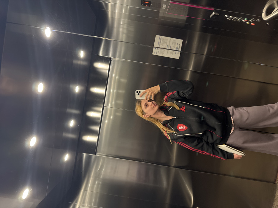 A blonde woman takes a selfie in a metal elevator. She wears a black zip-up jacket with red stripes and a white emblem, and grey pants. She holds a white phone in one hand and a white laptop in the other. The elevator's ceiling features round lights. Buttons, signage, and a handrail are visible on the elevator's back wall.