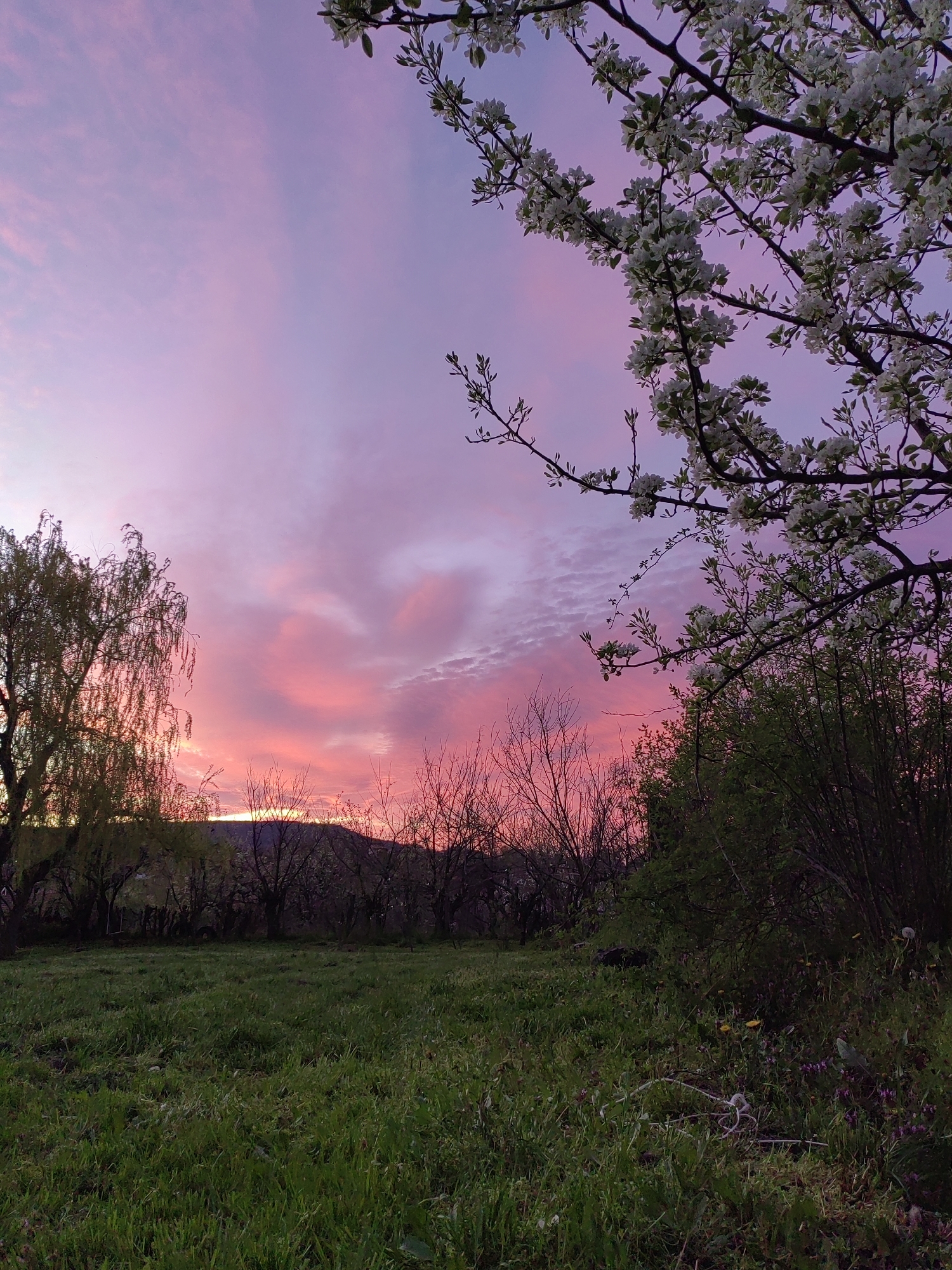 The photograph depicts an outdoor scene at dusk or dawn, likely in the countryside of Dragijevo, Bulgaria. A field of green grass occupies the foreground. In the middle ground are trees and shrubs, some with bare branches and others with dense foliage, suggesting early spring. A line of silhouetted hills or low mountains is visible on the horizon, backdropped by a vibrant pink and purple sky with clouds. A flowering tree branch with white blossoms is prominently positioned in the upper right of the frame.