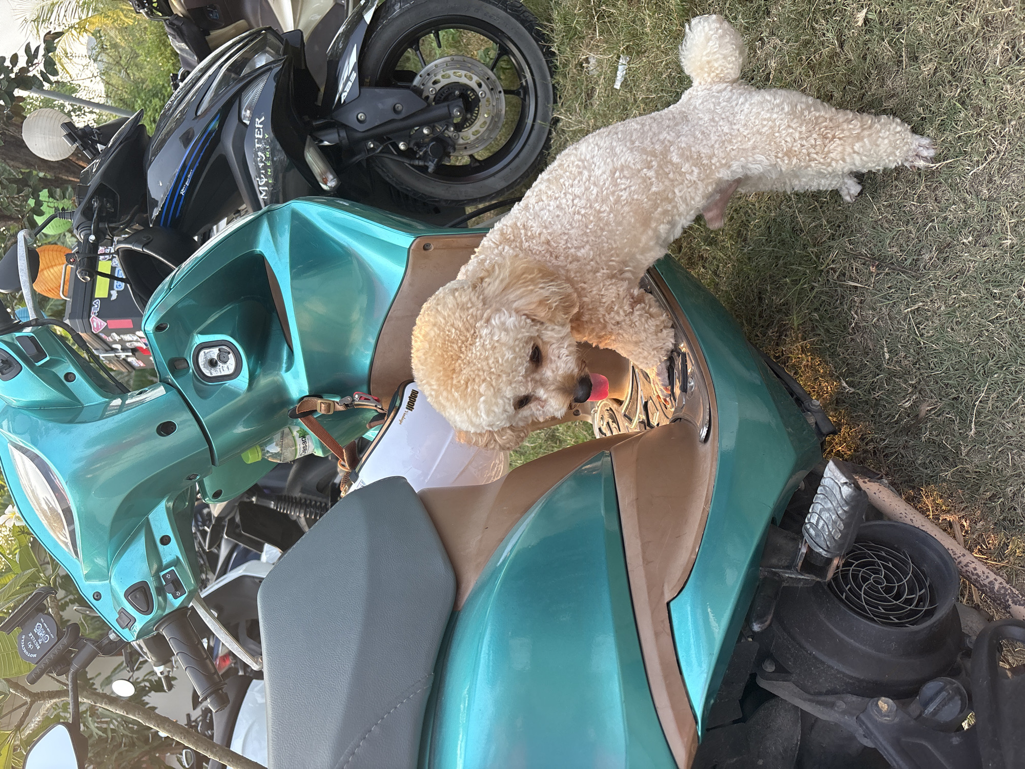 A light-brown poodle stands on the front section of a turquoise and tan scooter, its tongue protruding slightly. The scooter is parked on a grassy area. A black motorcycle is partially visible in the background. The location is presumed to be Bắc Nha Trang, Vietnam.