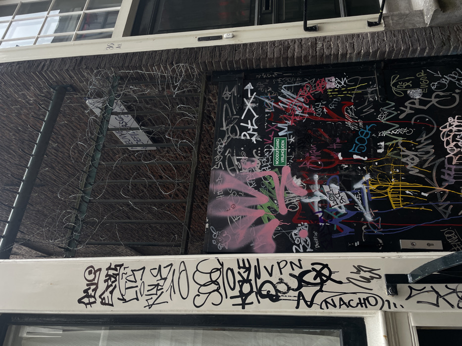 The image displays an exterior urban scene in Euvelpietersgasthuissteeg, Centrum, Amsterdam, Netherlands. The central element is a black metal door entirely covered in multiple layers of graffiti tags executed in various colors including pink, green, red, yellow, white, black, and blue. A small rectangular green sign with white text, "NOODUITGANG VRIJHOUDEN" (Emergency Exit Keep Clear), is affixed to the door. Above the door, a dark metal gate featuring pointed finials is densely wrapped with multiple strands of barbed wire. Behind this gate, a white rectangular sign is partially visible through the barbed wire, displaying the text "EUVELPIJPSG centrum". The gate is situated against a dark brick wall. To the left of the central door, a white vertical building element, likely a door frame or structural column, is heavily adorned with black graffiti tags. A window with a sheer white curtain is partially visible to the far left. To the right of the central door, a dark brick building facade is present. A light-colored door frame, marked with "36 hs.", frames a recessed dark-colored door. A black metal handrail is installed in front of this door, with visible steps below. No individuals or active subjects are present in the static scene.