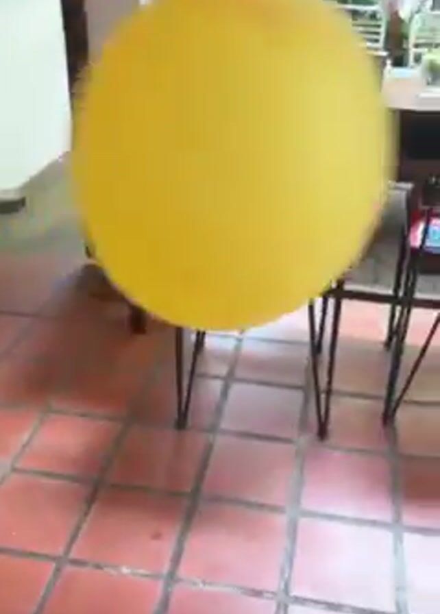 A boy in a striped shirt is playing with a yellow balloon in what appears to be a sunroom