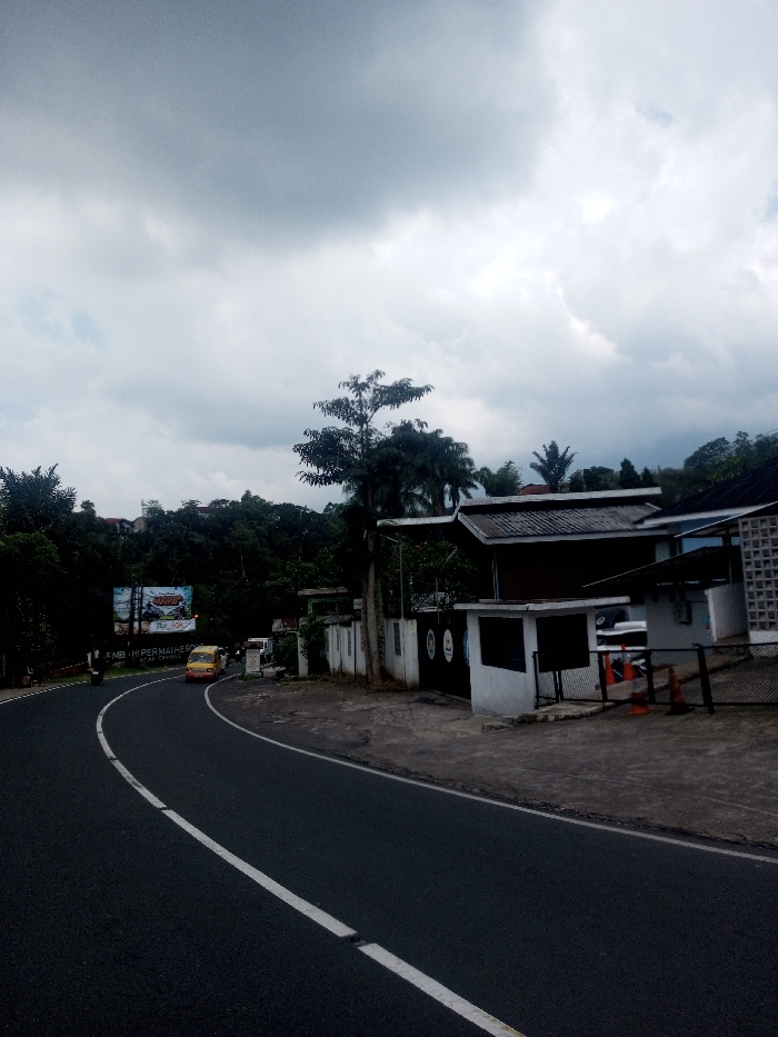 The image captures an asphalt road curving to the left, under a heavily overcast, grey sky in Kalchini, India