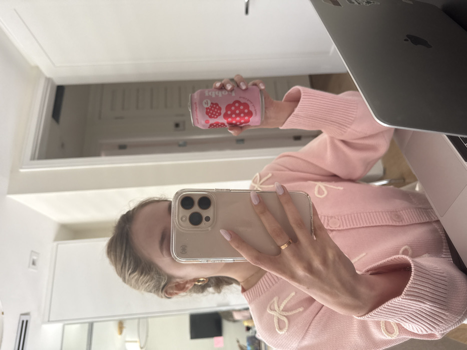 A female subject is depicted taking a mirror selfie indoors in Coral Gables, United States of America. She holds a light-colored smartphone with a clear case and a triple-lens camera system in her left hand, obscuring her face. Her left hand displays light pink painted fingernails and a gold ring on the ring finger. In her right hand, she holds a pink beverage can featuring red and white strawberry patterns and the brand name "rebby" printed vertically. The subject wears a light pink knitted cardigan embellished with white bow appliqués and a gold hoop earring in her visible left ear. A silver Apple MacBook laptop is partially visible in the lower right foreground. The background, reflected in the mirror, reveals white walls, white modern closet doors to the left, and an open white door leading to an interior hallway. A light fixture is faintly visible in the upper left reflection, alongside a dark screen with a pink sticky note.