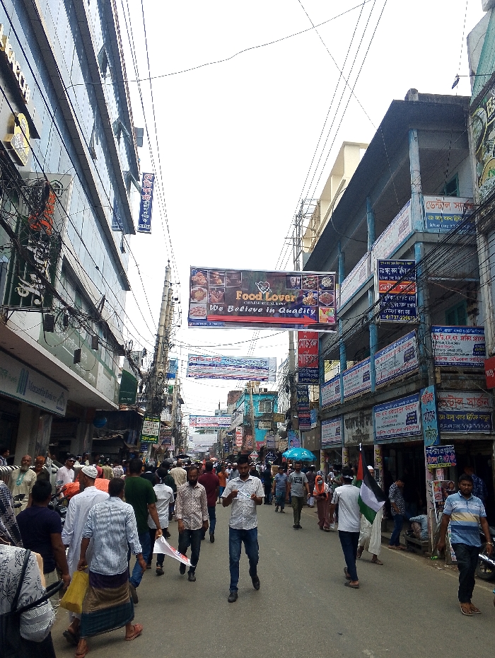crowded street scene in Bhola, Bangladesh, with coordinates 22.685, 90.644. The street is lined with multi-story buildings, some with storefronts and signs in Bengali script. A large banner for a restaurant called "Food Lover" is hanging across the street. The street is filled with people, many of whom are dressed in traditional clothing. They are walking, shopping, and interacting with each other. There are also some cars and motorcycles parked on the side of the road. The street is also cluttered with power lines and wires. The sky is overcast and there are no visible trees or vegetation. The environment is bustling and appears to be a busy commercial area.