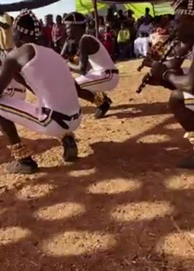In an outdoor setting, a group of men performs a coordinated dance while playing instruments