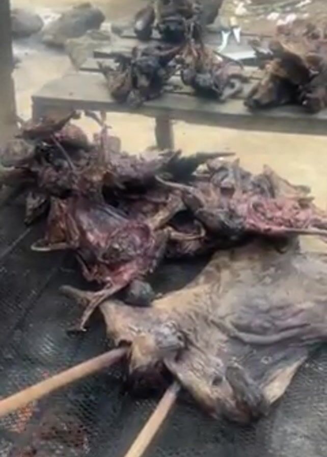 A full view of what appears to be game meat being prepared over an open fire. The meat is laid out on a black metal grill, with skewers propping up one larger piece. Additional meat portions are on a wooden table in the background. The environment appears to be outdoor, possibly rural, with glimpses of debris in the periphery. There is an indiscernible voice heard in the video.
