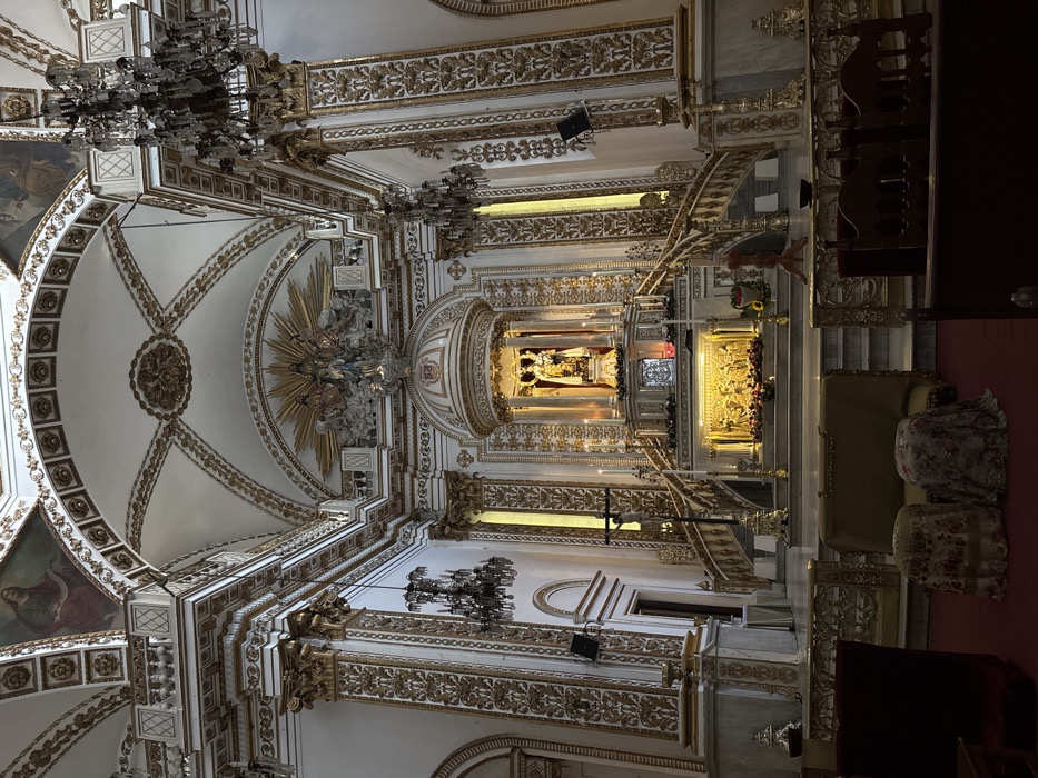 interior of a grand church. The ceiling is adorned with intricate gold patterns and paintings. Two ornate chandeliers hang from the ceiling. The walls are similarly decorated with gold detailing. The altar is brightly lit, showcasing religious figures. Rows of pews are visible on the right side, some occupied. The overall impression is one of opulence and reverence.