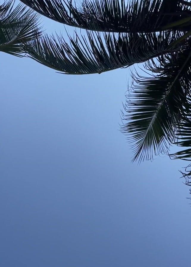 The camera looks up at a clear, light blue sky. In the top portion of the frame, the dark green fronds of several palm trees are visible. The fronds are silhouetted against the sky, and their intricate, feathered leaves are clearly defined. The camera appears to be stationary, capturing a tranquil view of a tropical scene.