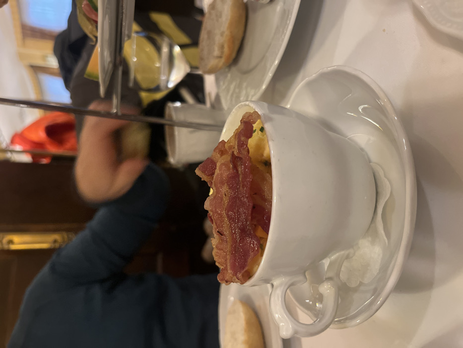This image depicts an indoor dining scene within a restaurant or cafe located in Wiesbaden, Germany. In the foreground, a white ceramic teacup, resting on a matching saucer, contains scrambled eggs garnished with chives and topped with several strips of cooked bacon. To the left of the teacup, a white plate holds half of a plain white bread roll. To the right, a clear stemmed wine glass filled with a clear liquid is visible, positioned in front of a multi-tiered metallic serving stand. A white plate on the lower right also displays half of a white bread roll. A slice of cantaloupe is visible on one of the upper tiers of the serving stand. In the blurred mid-ground, the upper torso and right arm of an individual wearing a dark teal or blue long-sleeved shirt are discernible, with their hand extended towards the multi-tiered serving stand, suggesting an action of selecting food. The background consists of dark brown wooden interior elements, a bright orange jacket hanging, and a soft, diffused light source, possibly a window. The overall setting indicates a meal service.