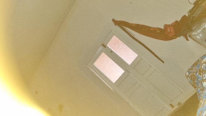 An interior scene in Yangi-Khayat, Uzbekistan, is depicted from an elevated, angled perspective, dominated by a strong, warm, yellowish light source originating from the upper left. A light-colored, double-leaf door, possibly white or off-white, is positioned diagonally in the mid-ground. Each door leaf features two upper rectangular panels fitted with frosted or textured translucent glass, which appears to transmit a soft, pinkish light. Below these glass panels, the door exhibits carved or recessed rectangular paneling. Leaning against the wall to the right of the door is a dark, slender, elongated object, consistent with a wooden stick or rod. Further to the right and partially obscured in the bottom right corner, a crumpled mass of reddish-orange fabric, possibly a garment or scarf, rests upon an unidentified object. This object bears partial, visible text fragments including "REVA..." and "VEC." In the bottom left foreground, a section of a patterned textile, displaying blue and gold floral or paisley designs on a light background, is visible. The walls and flooring appear to be a uniform light color, heavily influenced by the warm light source. No individuals are present in the scene.
