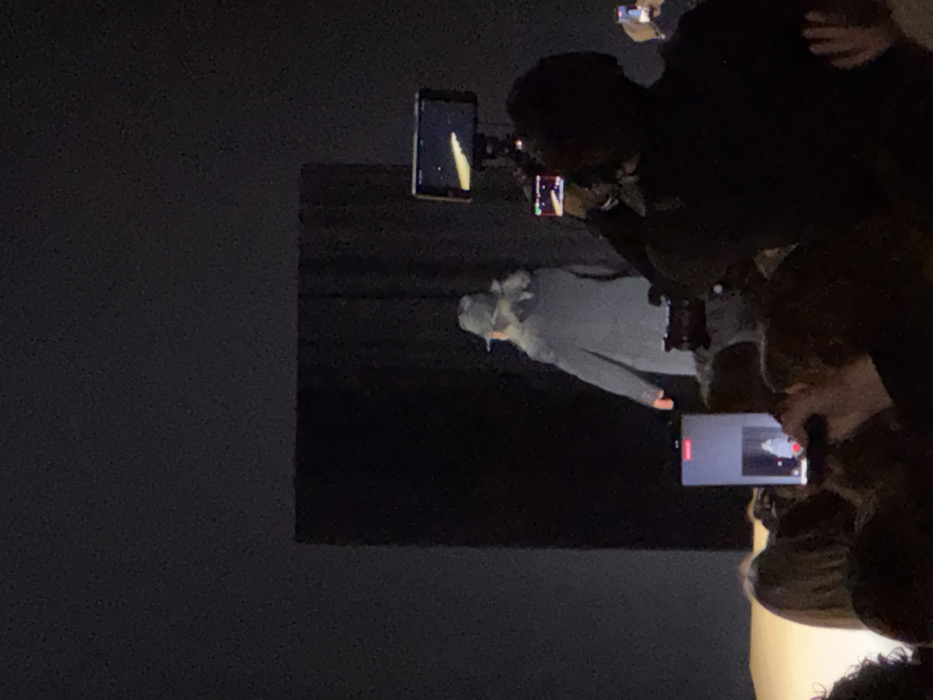 The image captures an indoor event scene, likely within an event venue in Paris, France. A central figure, viewed from behind, is walking from left to right across a light-colored stage surface towards a dark, vertical backdrop or curtain. This individual wears a dark, wide-brimmed hat, a long light-grey overcoat, and exhibits long, wavy light-colored hair extending from beneath the hat. In the foreground, a dense audience is visible, largely in silhouette. Numerous audience members are holding up illuminated smartphones, actively recording or photographing the event on stage. To the right of the frame, a professional video camera on a tripod is being operated by a partially visible individual. An external monitor attached to this camera displays a brightly lit, elongated object against a dark background. The environment is dimly lit, with the stage and central figure appearing to be illuminated by directed lighting.
