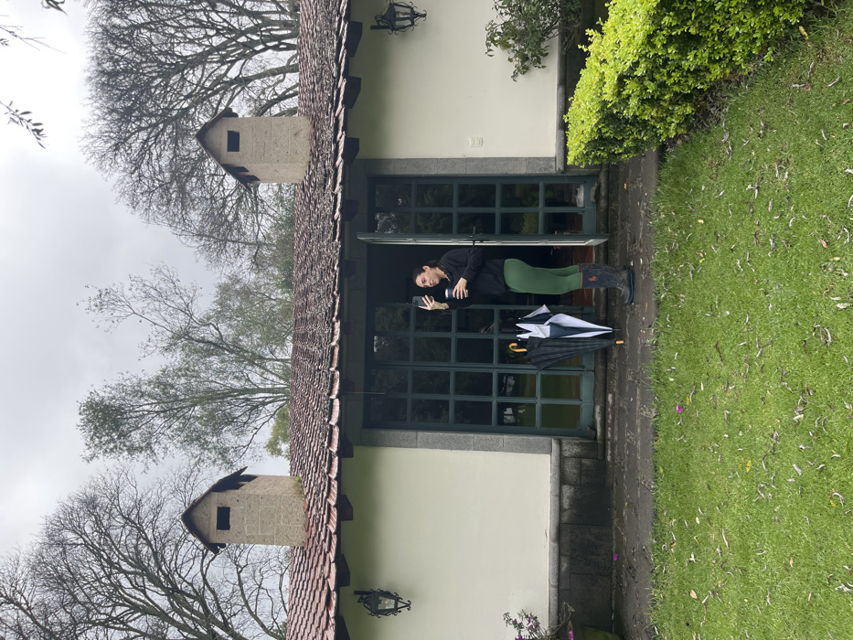 An adult female stands centered in the open double doorway of a building located in Huasca de Ocampo, Mexico. The building features a cream-colored facade, a red-tiled roof, and two symmetrical stone chimneys with small, rectangular vents, one on each side of the roofline. Two dark, ornate wall lanterns flank the entrance. The double doors are dark green with multiple glass panes and are open. The woman is wearing a black long-sleeved top, dark green leggings, and dark rubber boots with a white polo-style logo on the outer side of her right boot. She holds a white smartphone in her raised left hand, angled as if taking a picture or video of herself. In her right hand, she holds a dark-colored travel mug or cup. To her left, leaning against the door frame on the paved area, is a folded black and white striped umbrella with a wooden handle. The foreground consists of a green lawn scattered with light-colored debris. A low, manicured green hedge borders the paved area on the right. In the background, under an overcast sky, numerous trees with varying degrees of foliage are visible, some appearing bare-branched.