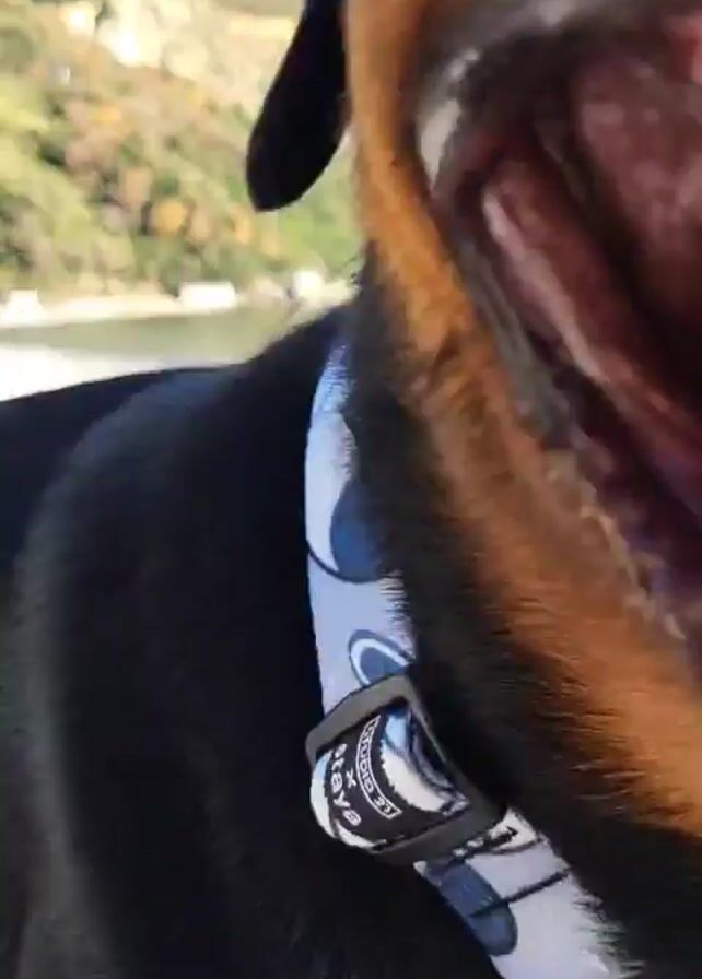 Two dogs, a brown and black Bernese Mountain Dog mix and a small white and brown Papillon dog, are playing fetch on a pebble beach. The Bernese Mountain Dog mix has a white collar on. The Papillon dog runs around excitedly. A tennis ball is thrown by someone out of frame, and the Bernese Mountain Dog mix chases after it and into the water. In the background, there is a building and a large green hill. The sky is blue and the weather is sunny.