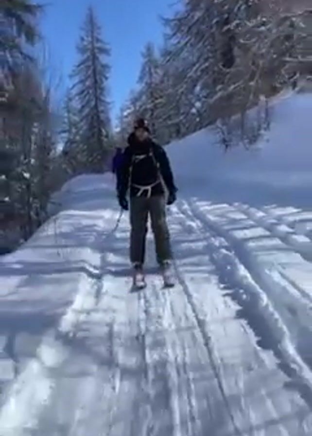 A person is skiing on a snowy path through a forest on a sunny day. The skier wears a black jacket, grey pants, and a black backpack. The path is lined with snow-covered trees. The camera shows the skier's point of view as they glide along the track. The skier appears to lose balance and falls, causing the camera to briefly show the ground.