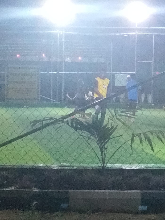 A group of individuals occupy a green field, partially obscured by a chain-link fence and foliage. One person wears a yellow jersey, while another is in a blue shirt. Overhead, bright lights illuminate the scene, casting a hazy glow. Bleachers are visible in the background, along with a wall or fence bearing a sign. A dark planter box rests along the bottom edge of the image.