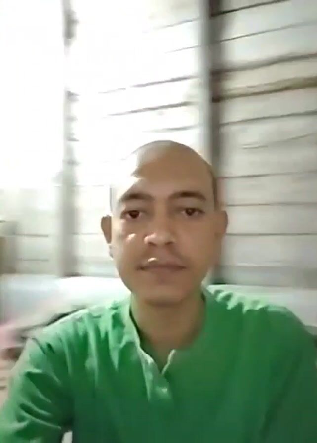 A medium-shot video shows a man with a shaved head wearing a green long-sleeved shirt