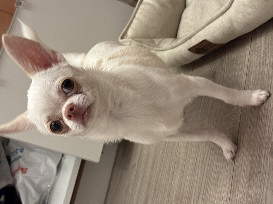 - "A small, white Chihuahua stands on a light wooden floor, its front legs stretched forward" by FM-08PzB2, licensed under CC BY 4.0