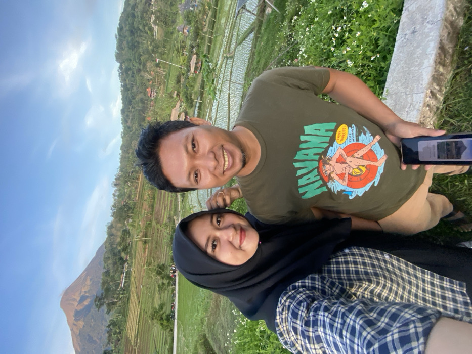 Two individuals, one female and one male, are captured in a selfie-style photograph in Penanggungan, Indonesia