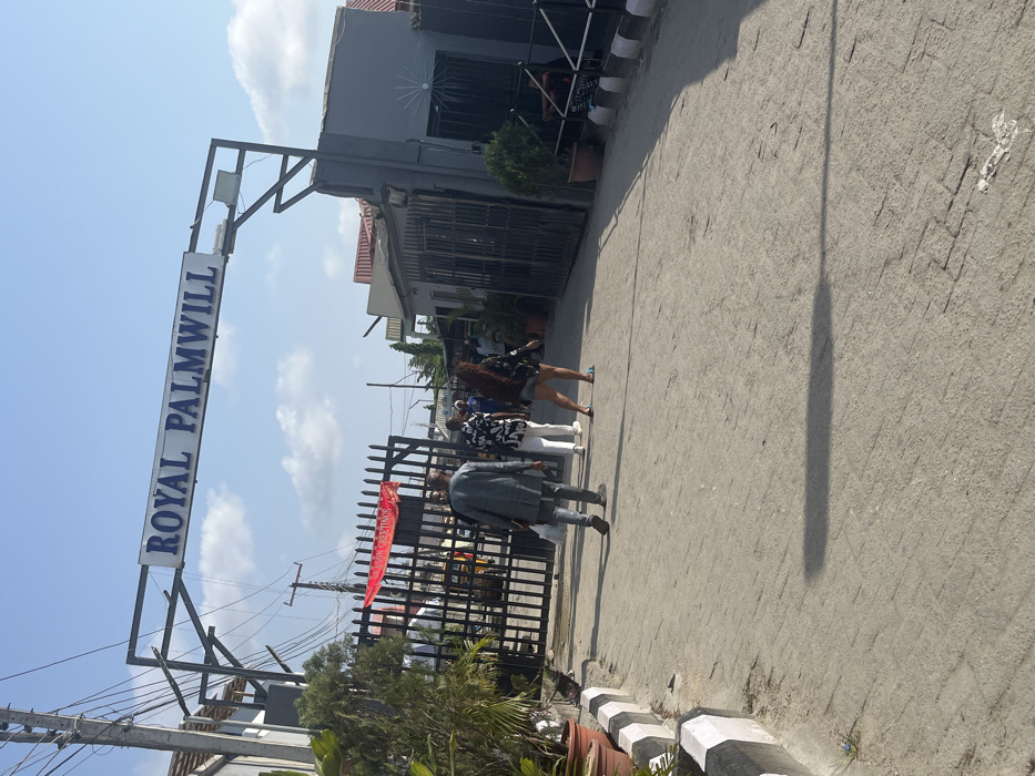 The image captures the entrance to "Royal Palmwill" in Lekki, Nigeria, under a clear blue sky with scattered clouds