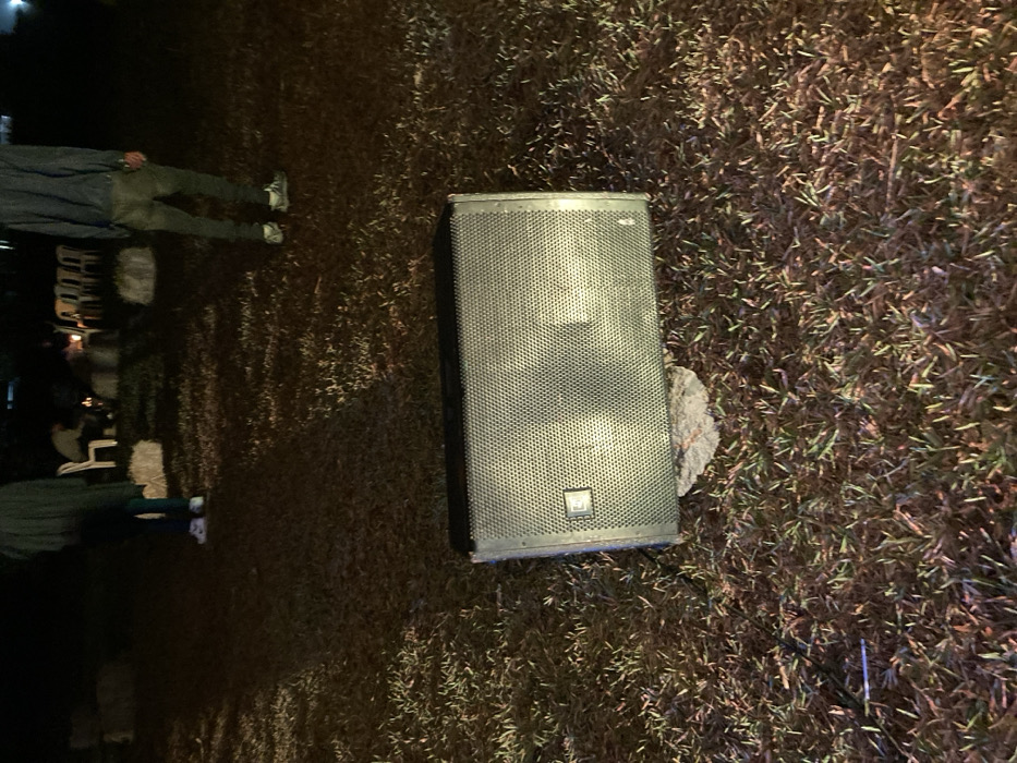The image depicts an outdoor nighttime scene in Murera ward, Kenya. In the foreground, a black, rectangular public address (PA) speaker with a gray metal mesh grille rests horizontally on a patchy grass surface, supported by a light-colored object underneath its center. A small rectangular emblem is visible on the left side of the speaker's grille. In the mid-ground, two individuals are standing on the grass; the person on the left wears dark trousers and white athletic shoes, while the person on the right wears dark trousers and light-colored athletic shoes. In the background, several white plastic chairs are arranged on the grass, some appearing occupied. A small, glowing light source, consistent with a campfire, is visible among the chairs. Multiple irregularly shaped, light-colored objects, resembling hay bales or bundled materials, are scattered across the grass. The environment is dimly illuminated by artificial light, casting visible shadows.