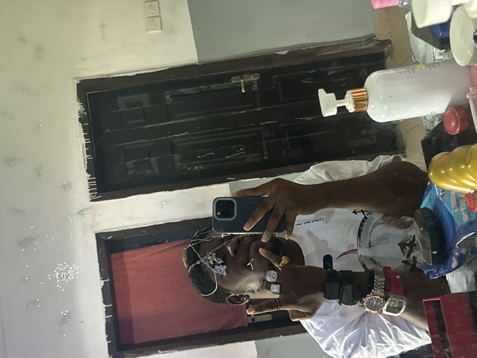A dark-skinned individual takes a mirror selfie in what appears to be a room in Asipa, Nigeria. The subject, seen from the chest up, wears a white short-sleeved t-shirt with a graphic design. They are heavily adorned with multiple silver-toned necklaces, including one with a cross pendant and another with a bear pendant. On their right hand (as seen in reflection), they wear three rings: a large square ring with clear stones, a large round ring with clear stones, and a plain gold-toned band. On their left wrist (as seen in reflection), they wear multiple timepieces, including a gold-toned watch with a metal band, a watch with a red silicone strap, and a black electronic device strapped above them. A metallic nose piercing is visible, and a small, light-colored object is held between the lips. The individual holds a dark-colored smartphone for the selfie, while their other hand is raised in a "rock on" gesture. The background, a reflection in the mirror, consists of light-colored walls with visible wear, stains, and numerous small, shimmering specks, potentially glitter or paint splatter, concentrated towards the top. Paint drip marks are also evident on the walls. Two dark brown/black wooden doors are visible; the one on the left has a red fabric partially covering its opening, while the one on the right displays significant wear, scratches, and a metallic handle. Two white electrical switch/socket plates are mounted on the right wall, above a grey painted stripe. The foreground surface, a cluttered countertop, holds various objects, including a white pump bottle with a gold-colored collar, a red cylindrical container, a yellow textured item, and other miscellaneous packaging and small containers.