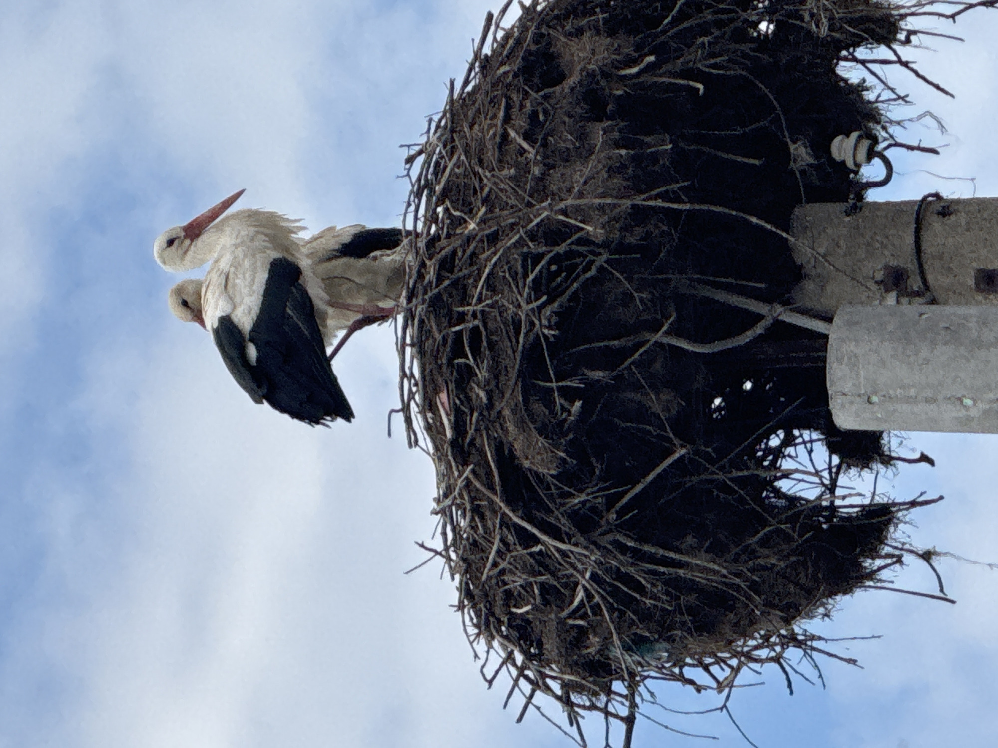 - "Two white storks with black wings stand in a large nest made of twigs on top of a concrete utility pole" by FM-7EcLC2, licensed under CC BY 4.0