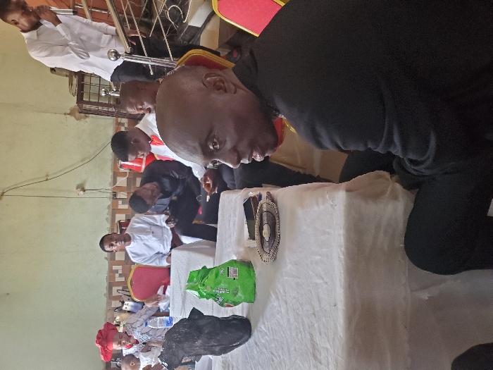 The scene depicts an indoor gathering in Lokoja, Nigeria, populated by several individuals. In the immediate foreground, facing right, is a dark-skinned male wearing a black jacket and black trousers, his head turned slightly left, revealing part of his profile and right ear. He appears to be seated at a table covered with a white tablecloth, which extends from the bottom left to the mid-right of the frame. On the table, from left to right, are a dark, irregularly shaped object (possibly a sculpture or decorative item), a bright green, crinkled plastic bag with visible text, and a circular, patterned tray containing smaller objects. A plastic water bottle is also visible behind the dark object on the left. Behind the foreground table, several individuals are seated or standing. To the left, a woman wearing a red headwrap and a white patterned top is seated, holding an infant. Next to her, a young man in a white tunic-style shirt is seated, looking forward. Further right, a man in a black long-sleeved shirt is seated, looking down at an object in his hands. Another man, wearing a white shirt with an orange tie, is seated next to him, facing left. In the background, on the right side of the frame, a man in a white long-sleeved shirt is standing on a staircase or elevated platform, partially obscured by a metal railing, appearing to interact with something off-camera to his right. The wall behind the seated individuals is light green with a lower section featuring patterned brown and white tiles. An electrical outlet and exposed wiring are visible on this wall. Red-backed chairs are interspersed throughout the seating arrangements. The lighting appears uniform, suggesting an indoor setting without strong directional light sources.