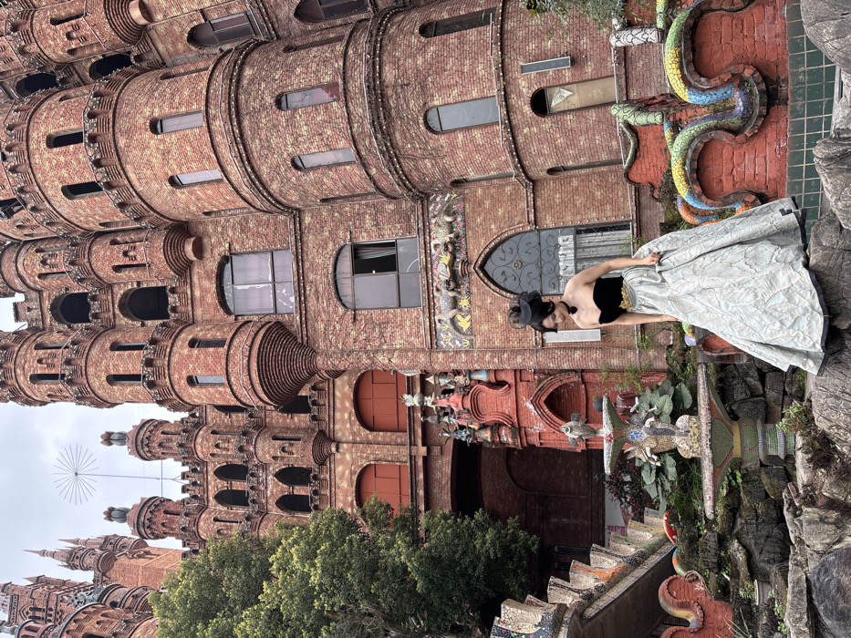 The image presents an outdoor scene in Baqiao, China, featuring a female subject positioned against an ornate, multi-storied castle-like building. The structure is predominantly constructed from reddish-brown brick, characterized by numerous cylindrical turrets, arched windows (several of which exhibit damage or appear boarded), and intricate mosaic detailing on its facade, including a frieze with animal figures above an arched entryway. The female subject, with dark hair styled upwards and wearing a black fascinator, a strapless black velvet top, a black choker, and a voluminous, textured light-colored full-length skirt, stands on dark, uneven rock formations in the mid-foreground. Her head is angled slightly left, with her gaze directed downward and to her left. Her right hand lightly holds a portion of her skirt. To her left, a multi-tiered fountain, adorned with colorful mosaic tiles and sculpted fish, is visible, partially obscured by dark green foliage. In the immediate foreground, colorful, mosaic-covered serpentine or dragon-like structures are situated on a reddish, textured base. The sky overhead is overcast and light gray. In the upper-left background, a large, multi-spoked wire structure, resembling a starburst or spirograph, is suspended against the sky by cables.