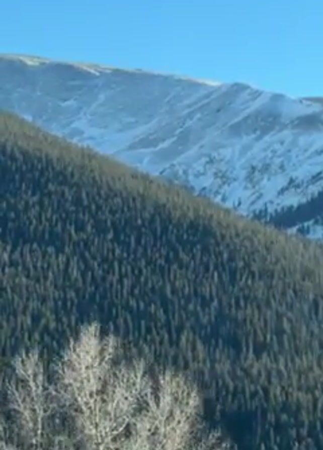 mountain landscape, partially covered with snow. The lower part of the mountain is covered with a dense forest of evergreen trees. The sky above is clear and blue. A car passes by in the foreground of the video, with its brake lights illuminated.
