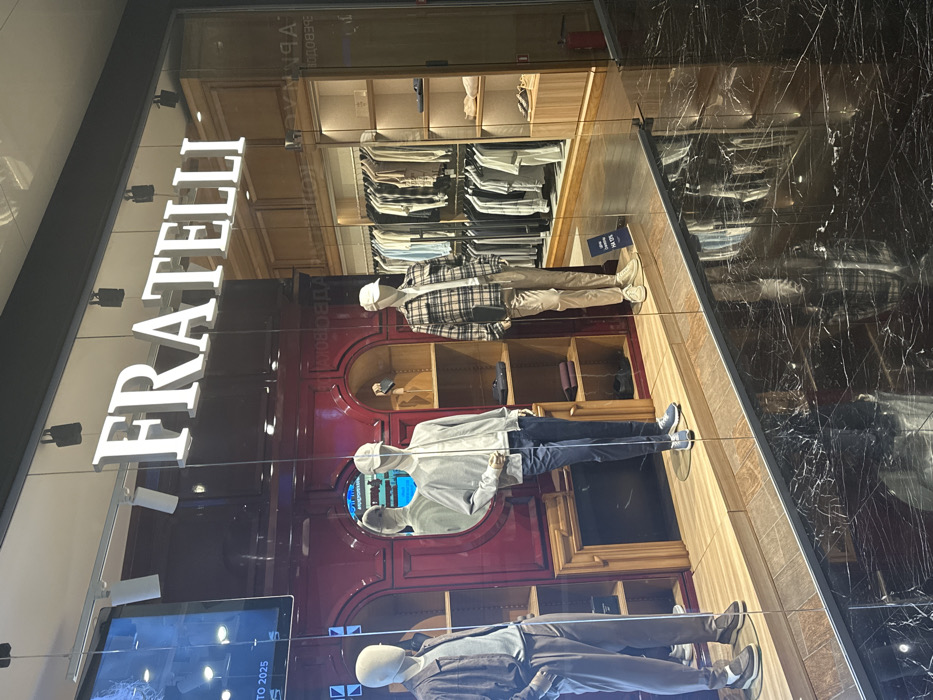 interior of a clothing store called "FRATELLI" located in Moskva, Russia at the coordinates 55.875, 37.47. The store's interior is modern, featuring sleek glass display cases, wooden shelving, and marble flooring. There are three mannequins wearing different outfits displayed in the store. The mannequins stand against the wall, their clothing arranged in a visually appealing manner. The store features an assortment of clothing items hung on racks in the background, as well as shelves stocked with accessories. The store's lighting is bright and modern, illuminating the space and highlighting the merchandise. The interior of the store is clean and well-maintained. The scene does not contain any people.