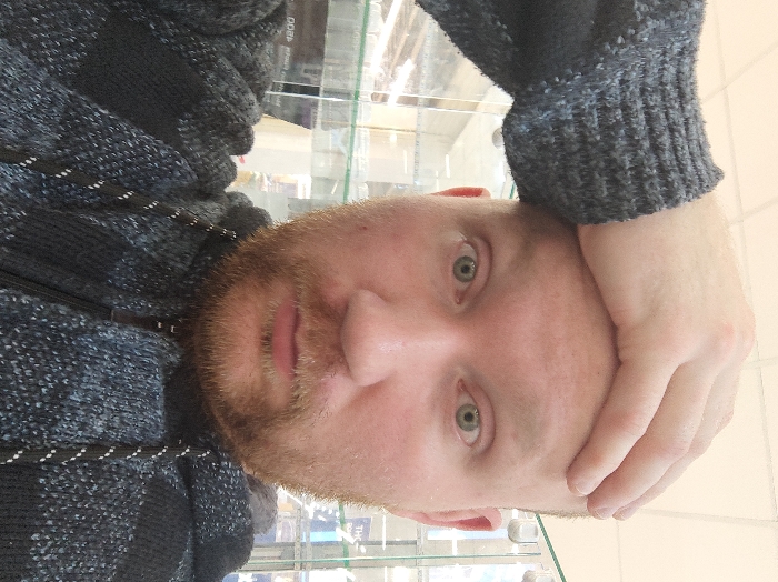 An adult male subject is depicted in a head-and-shoulders portrait. The subject has a bald scalp, a red-blonde beard and mustache, and light-colored eyes. His right hand, encased in a grey knitted sleeve, is positioned on his forehead. He is wearing a dark grey and light blue patterned knitted zip-up hoodie with black and white striped drawstrings. The subject is looking directly into the camera with a neutral facial expression. The background consists of a blurred indoor commercial environment, featuring reflections in glass display cases or windows and white ceiling tiles. Overhead lighting is reflected. The specific location within the city of Izhevsk, Russia, is not discernible from the visual evidence.