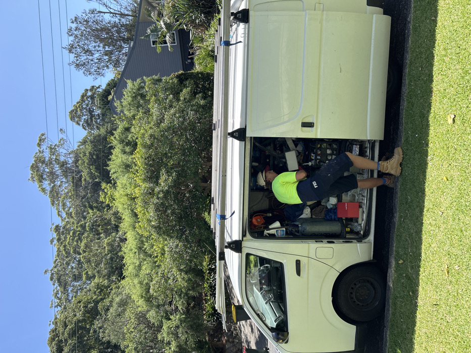 A light-colored van parked on grass has its side door open. A man wearing a hard hat, bright yellow shirt, and dark shorts is working inside. Various tools and equipment are visible within the van's storage area. A ladder is strapped to the van's roof. Trees and a house are in the background under a blue sky.