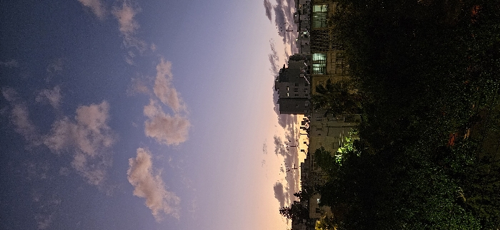A horizontal shot depicts a sky transitioning from blue with scattered clouds on the left to a vibrant orange and purple on the right. Buildings stand silhouetted against the colorful sky. Dark green trees and foliage occupy the right foreground. The buildings appear residential and commercial, with windows glowing faintly. The photograph evokes a peaceful, urban evening scene.