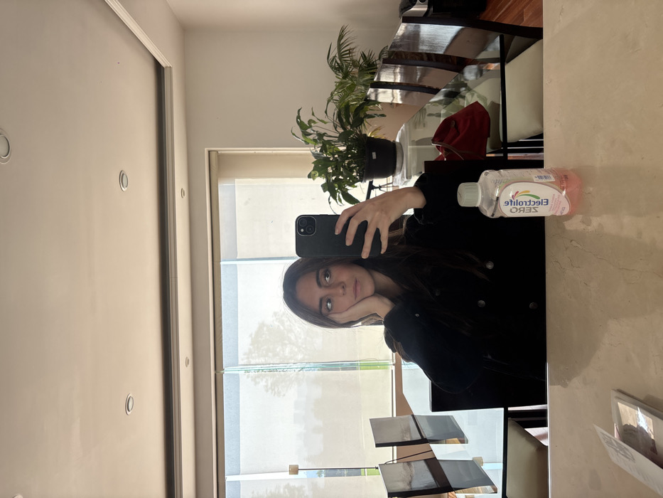 A woman takes a mirror selfie, her face resting on her hand. She wears a dark-colored button-down shirt. Behind her, a window with blinds is visible. A table reflects chairs and part of a plant. A bottle of electrolyte drink lies on the table near the mirror's edge. The room appears well-lit, with recessed lighting visible on the left.