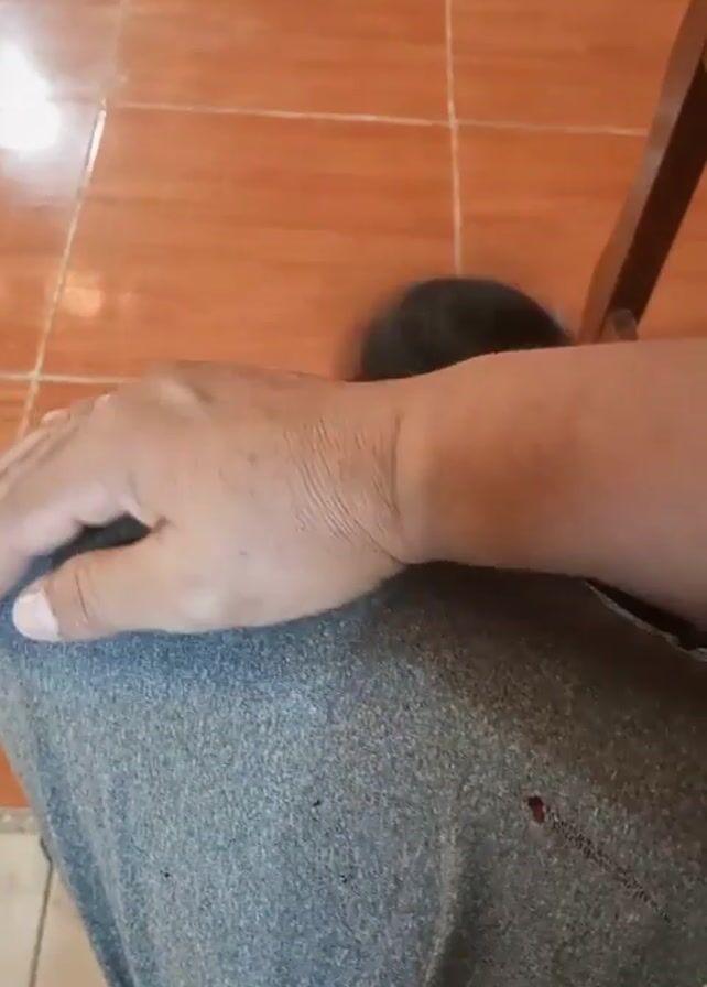 A person is sitting in a wooden chair, petting a small, black cat in their lap. The person is wearing grey sweatpants. The cat is mostly hidden, with its head occasionally peeking out from under the person's arm. The background features a tiled floor, appearing to be either orange or light brown. A portion of the chair leg is visible in the upper-right corner of the frame.