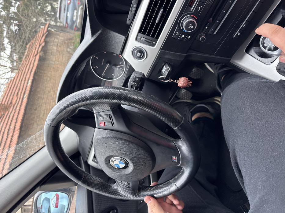 The image depicts the interior of a BMW vehicle, observed from the driver's perspective, looking forward through the windshield. A person, clothed in dark attire and sneakers, occupies the driver's seat. The individual's left hand is positioned on the black, leather-wrapped, perforated steering wheel, which bears a BMW logo and an "M" badge. The right hand rests on a manual transmission gear lever. A car key, accessorized with a reddish-brown, textured keychain charm, is inserted into the ignition slot on the dashboard. The dashboard displays an analog speedometer and tachometer, a "Start/Stop Engine" button, and a climate control panel indicating "22.0°". Through the windshield, an exterior street scene is visible under an overcast sky. In the mid-ground, an older building with a prominent reddish-brown tiled roof and light-colored walls is present. Further down the street, a blue/grey SUV with a Bulgarian license plate (partially visible, including "BH" and other alphanumeric characters) is parked or moving away. The presence of the Bulgarian license plate confirms the location as Bulgaria. While the image's context is specified as Kostinbrod, Bulgaria, no discernible landmarks within the visual evidence allow for a precise identification of a specific location within that city. The driver's side mirror reflects a portion of another light-colored vehicle. The upper left section of the windshield exhibits minor cracking or surface marks.
