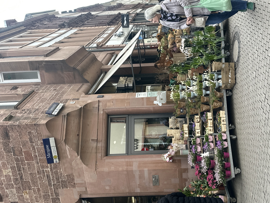 street corner in Heidelberg, Germany (latitude: 49.411, longitude: 8.7), with a flower shop on the corner. The street signs indicate the intersection of "Märzgasse" and "Hunnenstr." There are a variety of potted plants and flowers displayed in front of the shop, including white snowdrops, pink and purple flowers, and green foliage. A woman wearing a grey jacket, black scarf, and blue jeans is standing next to the display and looking at something off camera. The buildings are old and have a red brick facade. The pavement is grey and cobblestone. The scene is lit by natural light, and the sky is overcast.