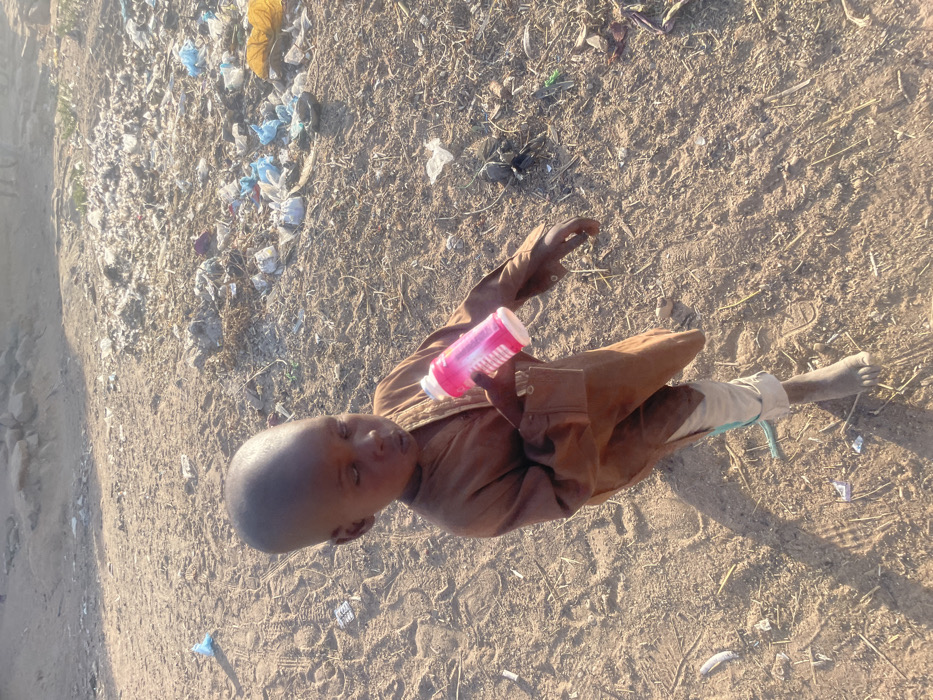 A young child stands outdoors in Numan, Nigeria, on dry, light-brown earth. The child, with dark skin and a short-cropped or shaved head, wears a loose-fitting, long-sleeved brown tunic over lighter trousers, with bare feet. They hold a pink plastic bottle with a white cap in their right hand, appearing to look downwards or with eyes partially closed. The ground around the child exhibits visible footprints and tire tracks. To the right and in the background, a significant accumulation of scattered refuse, including blue, white, and yellow plastic bags, paper, and other debris, is present. Sunlight casts a distinct shadow from the child to their left.