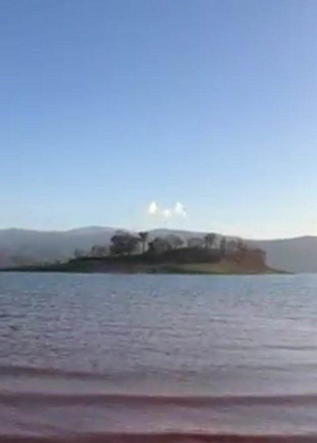 The video opens with a wide shot of a body of water under a clear, blue sky. The water is calm, with gentle ripples on the surface. In the distance, there is a landmass with some buildings visible. The shoreline in the foreground is reddish-brown. The camera gradually zooms in on another landmass in the distance, revealing trees, greenery, and hints of mountains in the background. Two distinct, fluffy clouds are visible in the sky above the trees. The water remains calm throughout the zoom.