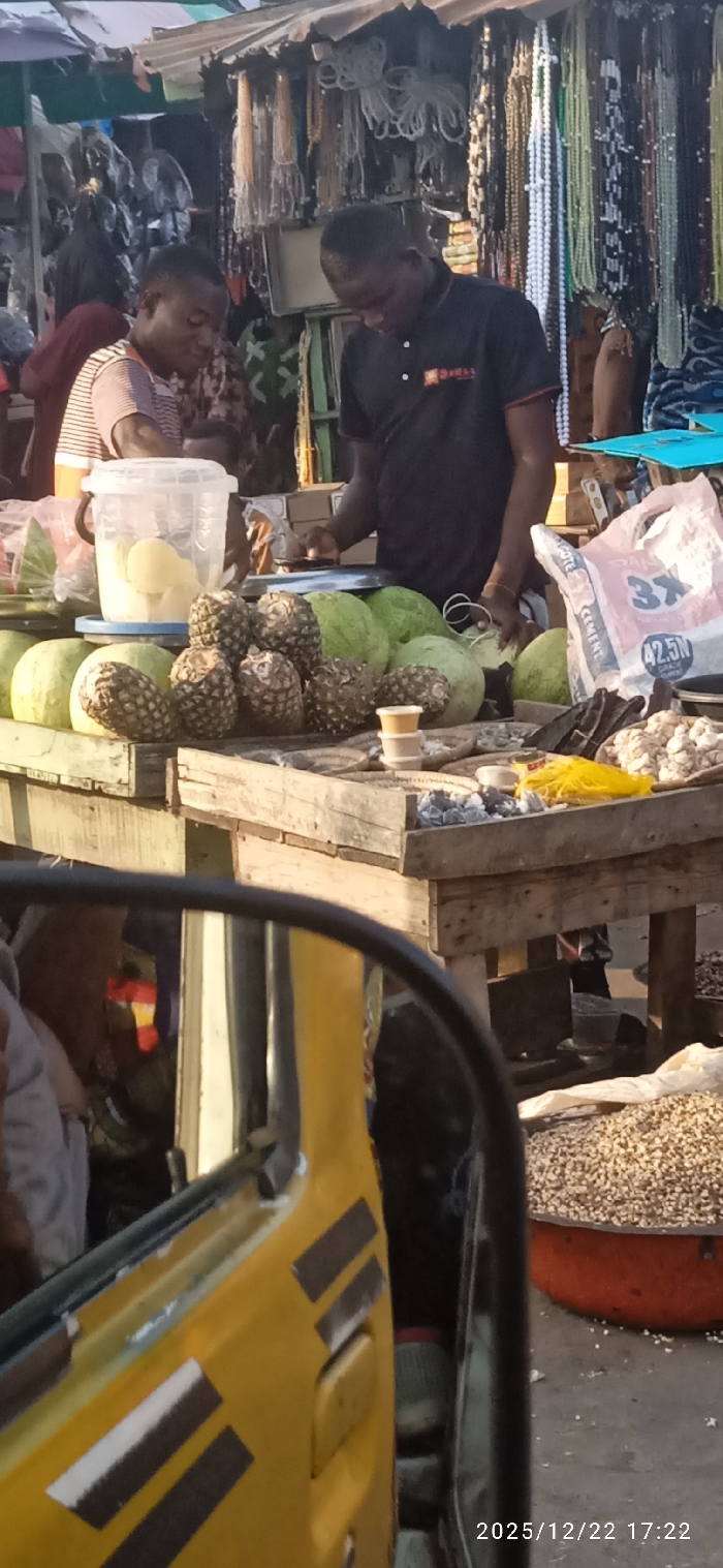 The image depicts an outdoor market scene in Lagos, Nigeria, at approximately 17:22 on December 22, 2025, viewed from the interior of a yellow motorized tricycle (keke napep) with its black mirror frame partially visible in the immediate foreground. Central to the scene is a wooden market stall laden with produce. On the left, a person in a horizontal striped shirt (white, orange, brown) stands near a clear plastic container holding peeled, light-colored fruits, possibly pineapples or potatoes. To their right, a male vendor with short dark hair, wearing a black polo shirt with a small chest logo, leans over the stall. He is actively engaged with items on a silver weighing scale, his hands positioned above it. The stall displays a variety of items: a central pile of approximately eight small pineapples, surrounded by several large, light green fruits (likely watermelons or gourds). To the right of the vendor's hands are two stacked beige cups, woven trays containing small, grey, pebble-like items, and a yellow plastic bag. A white bag labeled "DANGOTE CEMENT 3X 42.5N" leans against the stall's front right. Below the stall, a red circular basin containing granular material and a white sack with similar contents are partially visible. The background reveals other market structures with corrugated metal roofs. Hanging displays behind the main stall feature numerous strings of beads, necklaces, and other accessories, indicating a jewelry or adornment vendor. Other indistinct figures are present in the background, suggesting market activity. The overall lighting suggests late afternoon conditions.