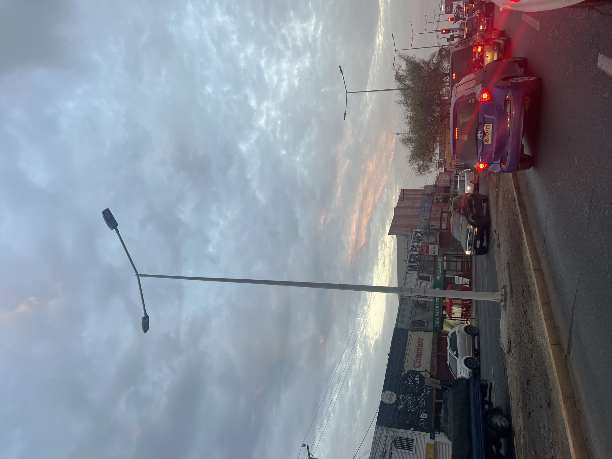 Here is a detailed description of the image: The image shows a congested street scene in Arica, Chile, at dusk. The focus is on the traffic in the right foreground, consisting of several cars stopped at a traffic light. A blue Toyota car with the license plate "PB-RX-71" is prominently visible in the right-center of the frame. Further ahead, a line of vehicles waits at the red light, their brake lights illuminated. On the left side of the street, there are several buildings, some with advertising signs. The signs indicate businesses such as "Chnmarc," "MUEBLES ARCA," and "Sushy Mario's." There is also a sign for Coca-Cola. A street lamp stands tall, adding to the streetscape. The sky is overcast with gray clouds, tinged with a faint sunset glow, suggesting it's either the end of the day or the beginning of a gloomy one. The overall scene portrays typical urban congestion at that time.