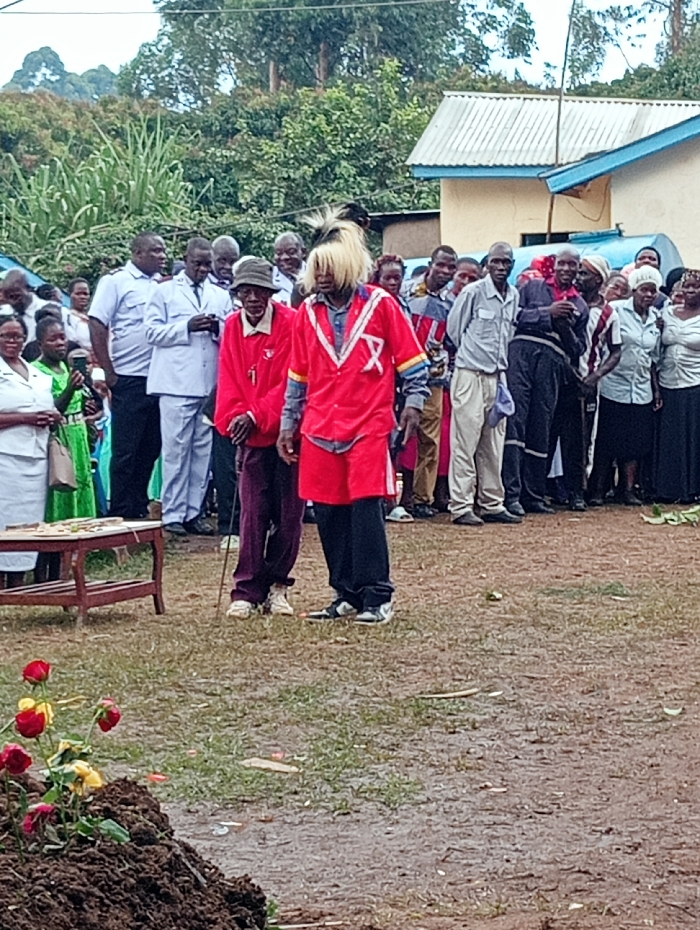 The image depicts an outdoor gathering in Lumakanda ward, Kenya, characterized by an overcast sky and damp ground with visible mud and sparse grass. In the immediate foreground, a mound of dark, freshly disturbed soil is present on the right, adorned with several red and yellow roses. To the left, a small, low, brown wooden table stands on the ground, with indistinct flat objects on its surface. Two adult males are prominent in the central midground. The man on the left appears older, wearing a dark cap, a red long-sleeved top over a lighter garment, dark trousers (possibly maroon or purple), and light-colored shoes. He holds a walking stick in his right hand. The man to his right wears a distinctive costume featuring light-colored, spiky hair, a vibrant red tunic with white V-shaped patterns on the chest and multi-colored stripes on the sleeves, a visible blue shirt underneath, dark trousers, and dark shoes. Both men are standing and facing generally towards the left side of the frame. Behind these two figures, a crowd of approximately 30 to 40 individuals, comprising men and women, stands in several rows, observing the scene. Their attire varies; some men wear light blue or white collared shirts, suggesting uniforms, while some women wear white smocks or light-colored blouses and dark skirts. Others are dressed in casual clothing. In the background, dense green vegetation, including trees and broad-leafed plants, extends across the upper portion of the image. To the right, a building with a blue-edged, corrugated metal roof is visible, with a blue cylindrical tank positioned next to it.