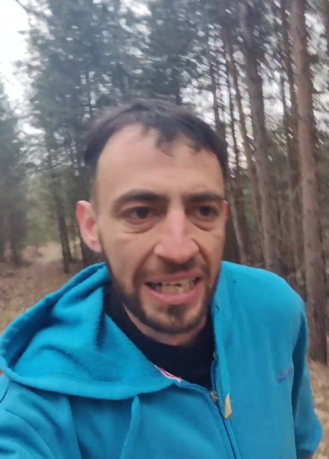 A man jogs through a sparse forest, holding the camera. The man has a short beard, brown hair, and wears a bright blue hooded sweatshirt. The forest contains a mix of thin, tall trees and other bare trees. The ground appears covered with leaves. The sky is overcast.