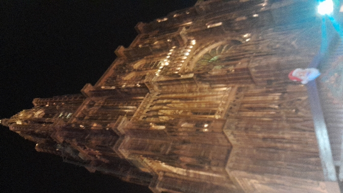 A low-angle, nighttime shot presents a tall, Gothic building, likely a cathedral, its stone facade illuminated. Ornate architectural details, including arches, windows, and layered stonework are prominent. The structure is viewed from the ground, emphasizing its height and grandeur against a dark sky. A lamp post partially obstructs the view. The photo is somewhat blurred and grainy.
