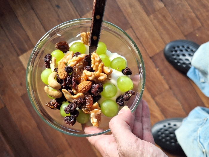An overhead photograph captures a clear glass bowl held in a person's left hand. The bowl contains a white base, likely yogurt, generously topped with whole green grapes, dark raisins, whole cashews, whole almonds, and fragments of walnuts. A spoon with a dark, patterned handle is partially submerged in the bowl's contents on the right side. The lower portion of the image reveals the person's feet, clad in light blue jeans and black perforated clogs, standing on a polished wooden plank floor. The environment is indoors. The precise location within Cordoba, Argentina, is not discernible from the image's visual elements.
