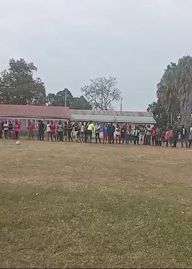 soccer game or practice taking place outdoors on a grass field. In the background, a building that looks like a school or community center stretches across the field of view, with a crowd of spectators lined up along its edge, watching the activity. The crowd consists of people of various ages, dressed in casual clothing. A soccer goal stands on the right side of the frame, and a player in a green jersey is seen taking a shot at the goal from the left side of the field. A second person is standing closer to the goal, potentially a goalie. The sky is overcast, suggesting a cloudy day. The overall environment appears to be a rural or suburban setting with trees scattered around the periphery of the field.