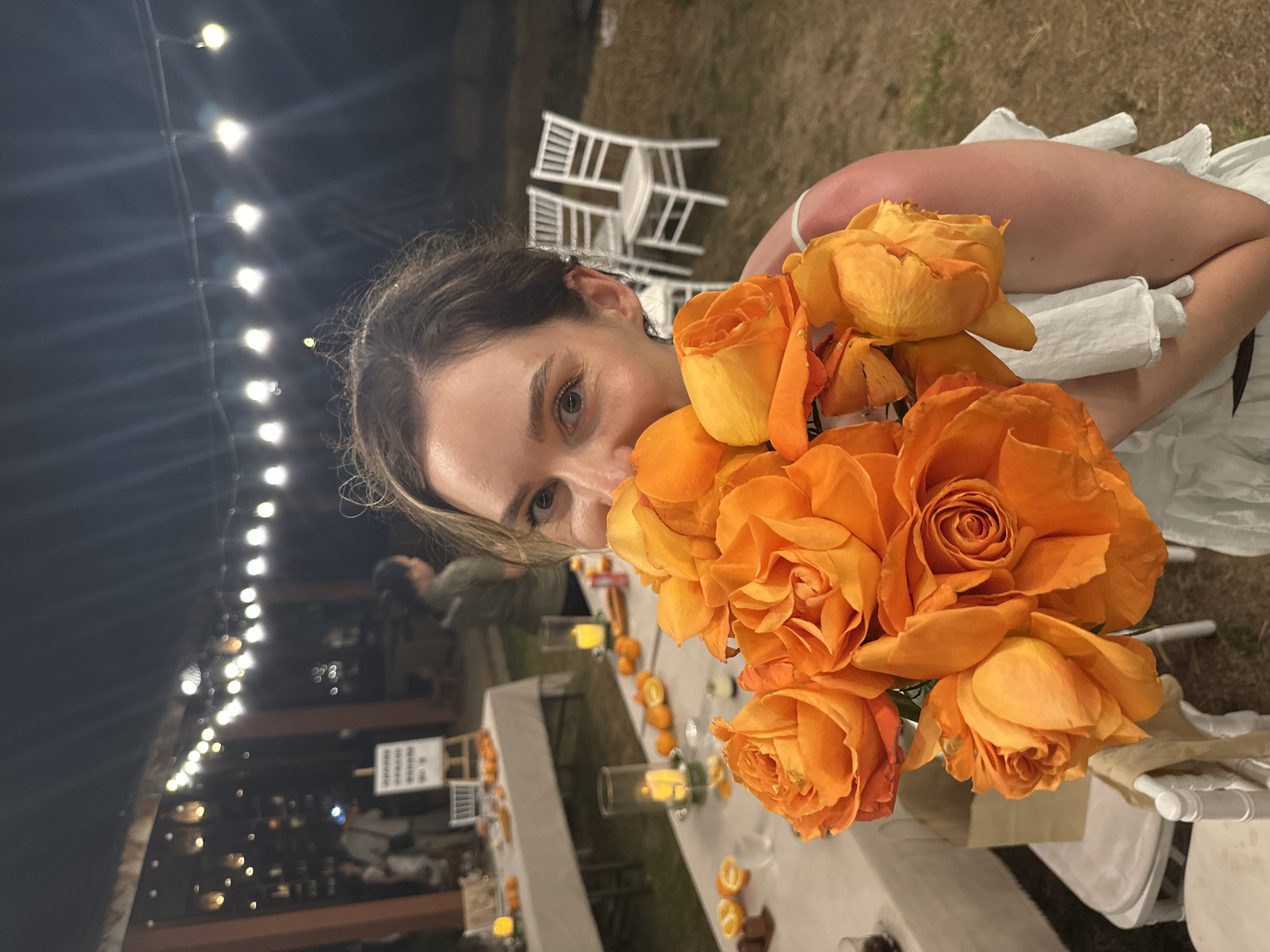 A woman with light skin and dark hair is positioned in the foreground, holding a large bouquet of vibrant orange roses that partially obscures her face, revealing her upper face and left eye. She wears a light-colored, possibly white or light blue, ruffled garment. The scene is an outdoor night event in Si Sunthon, Thailand, illuminated by string lights and lanterns suspended above. Behind the woman, an event space is visible with multiple long tables covered in white tablecloths. These tables are adorned with numerous lit candles in clear cylindrical holders, scattered whole and halved oranges, and small dark decorative items. White Chivari-style chairs are arranged around the tables and in the background. A dark wooden structure, possibly a pergola or pavilion, supports the overhead lighting. In the background, out of focus, several individuals are present; one person in a light shirt is holding a phone as if taking a picture, and another in a dark green shirt is partially visible. The ground is an outdoor dry grassy or dirt area. A white easel sign with dark lettering stands on one of the tables in the midground.