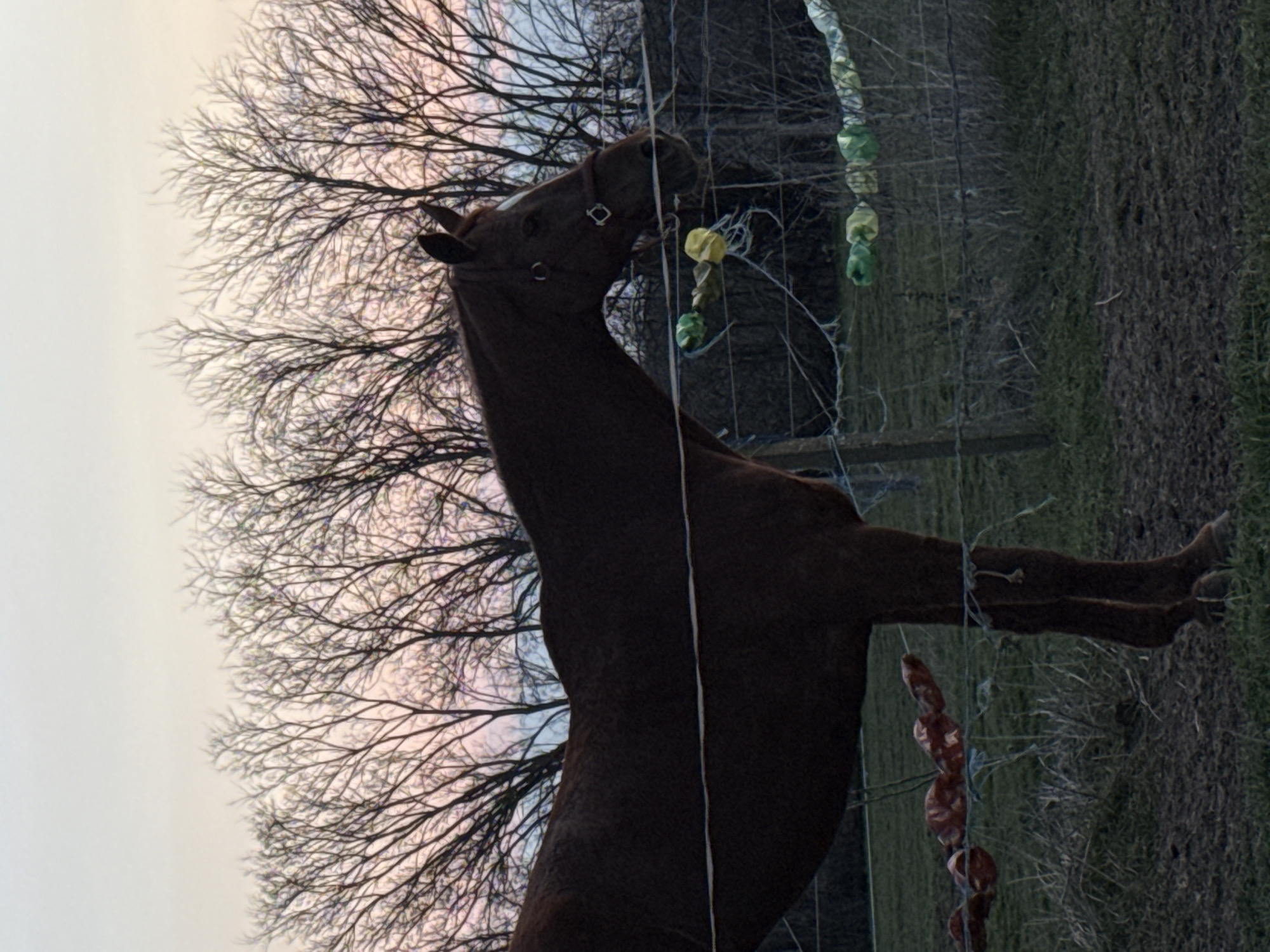 The image captures a dark brown horse standing in a field in Sandrovo, Bulgaria. The horse is positioned in profile, facing right, with a visible white blaze on its forehead and wearing a brown bridle. Its head is lowered, and its mouth is slightly open, positioned near a wire fence. The fence consists of at least two main wires strung between wooden posts. Attached to the upper wire are multiple yellow and green plastic objects, possibly cut bottles, some exhibiting frayed edges. On the lower wire, to the left of the horse, are several reddish-brown, cylindrical objects resembling sausages or cured meat, strung along the wire. Similar green and yellow plastic objects are also visible on the lower wire to the right. The immediate foreground features a patch of bare, muddy earth, transitioning into sparse green grass. Behind the fence, dry brush and a row of leafless deciduous trees are silhouetted against a sky showing a gradient of light blue, pink, and yellow, consistent with either sunrise or sunset.